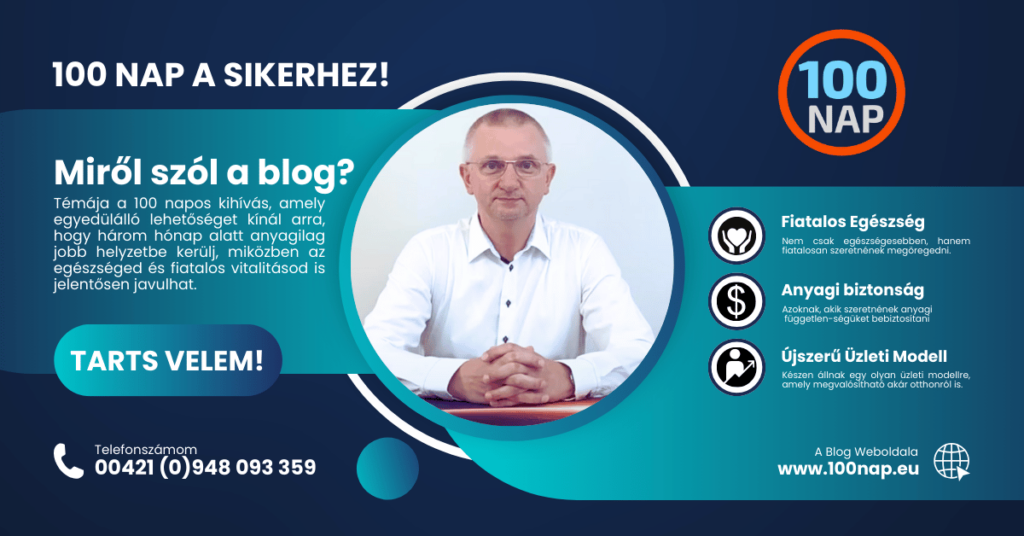 A bejegyzéseim központi témája a 100 napos kihívás, amely egyedülálló lehetőséget kínál arra, hogy három hónap alatt anyagilag jobb helyzetbe kerülj, miközben az egészséged és fiatalosságod is jelentősen javulhat.